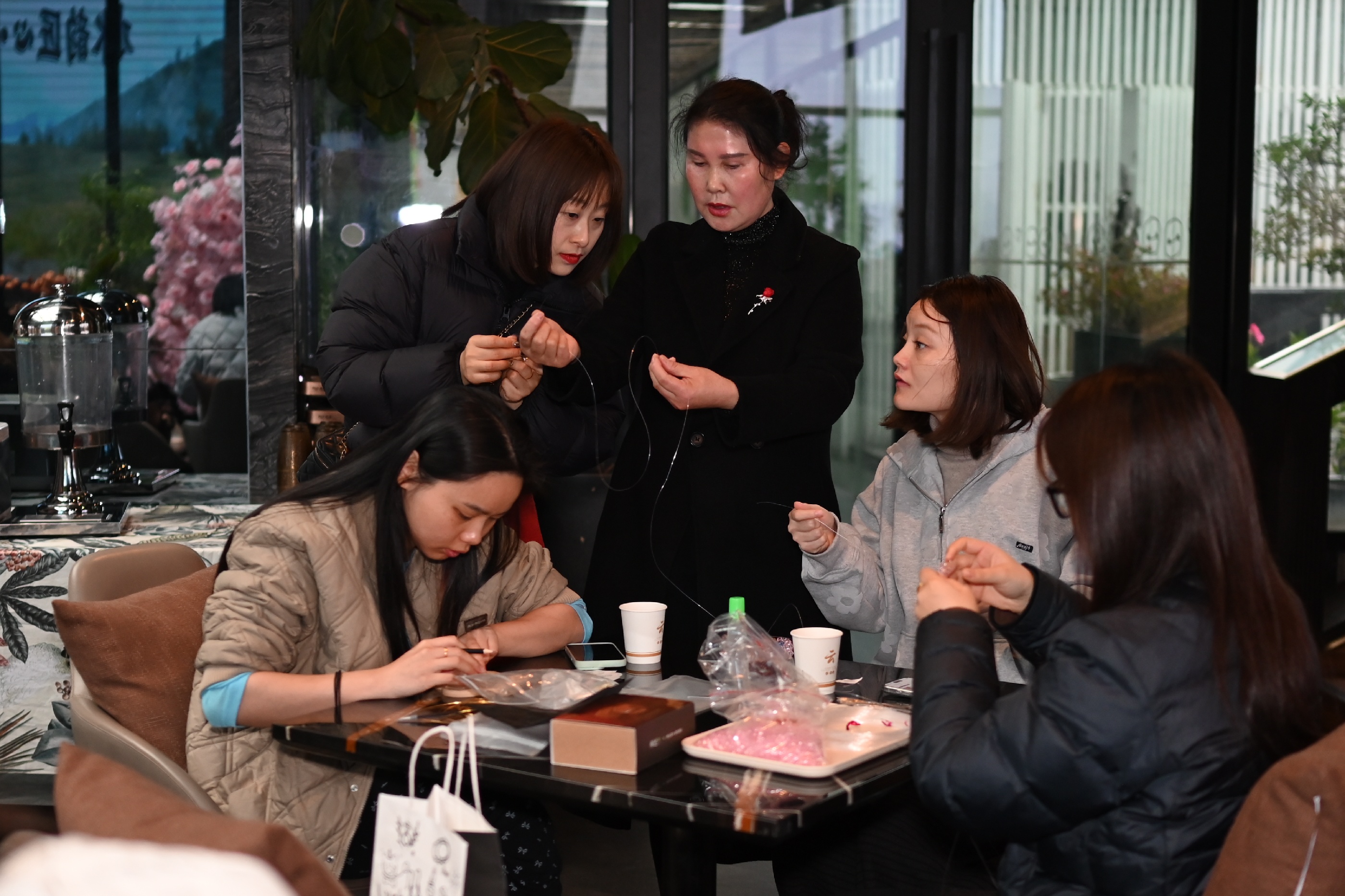 活動(dòng)伊始,兩位指導(dǎo)老師分別講解掐絲琺瑯的技法和串珠包的編織技巧。隨后,女員工們們迅速投入創(chuàng)作——掐絲琺瑯工藝區(qū),大家用鑷子將金絲彎折成型,在盤(pán)底勾勒出蓮花、游魚(yú)或水波紋,再用鏟刀將彩砂層層點(diǎn)染,金絲與釉料交相輝映,一幅幅作品逐漸呈現(xiàn)。一旁的串珠包制作區(qū)同樣熱鬧非凡,晶瑩珠串在指尖流轉(zhuǎn)穿梭,穿針引線、配色綰結(jié),巧思于方寸間緩緩鋪展,一只只精巧別致的串珠包悄然成型。